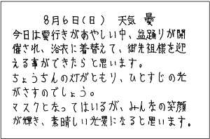 町内会の盆踊りに行く前に自宅で撮った写真とその日の日記です。日記は小学生から続けていますが、独特な言い回しで、常人にはちょっと分かりにくいです。もなみ会アソシエベーグルで9年目。洗い、計量などの作業に休まず、楽しく通っています。 |