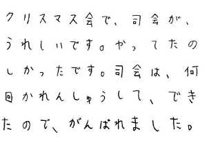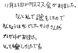 クリスマス会 11月23日(木・祝日)に厚別区民センター2階ホールで、だいぶ早目(笑)のクリスマス会を4年ぶりに開催しました。23家族62人の参加でした。 まだ、コロナ前のようなみんなでワイワイ交流するクリスマス会はできませんでしたが、札幌笑劇団さんに来ていただき、ステージを楽しみました。 当日の司会はダウン症のある本人たちが大活躍してくれました。そしてサンタさんも来てくれました! 短い時間でしたが、久しぶりにみんなで顔を合わせて、開催前にはたわいないおしゃべりも楽しみ、とても素敵なクリスマス会でした。 参加の皆さん、ありがとうございました。 (記 三好) |